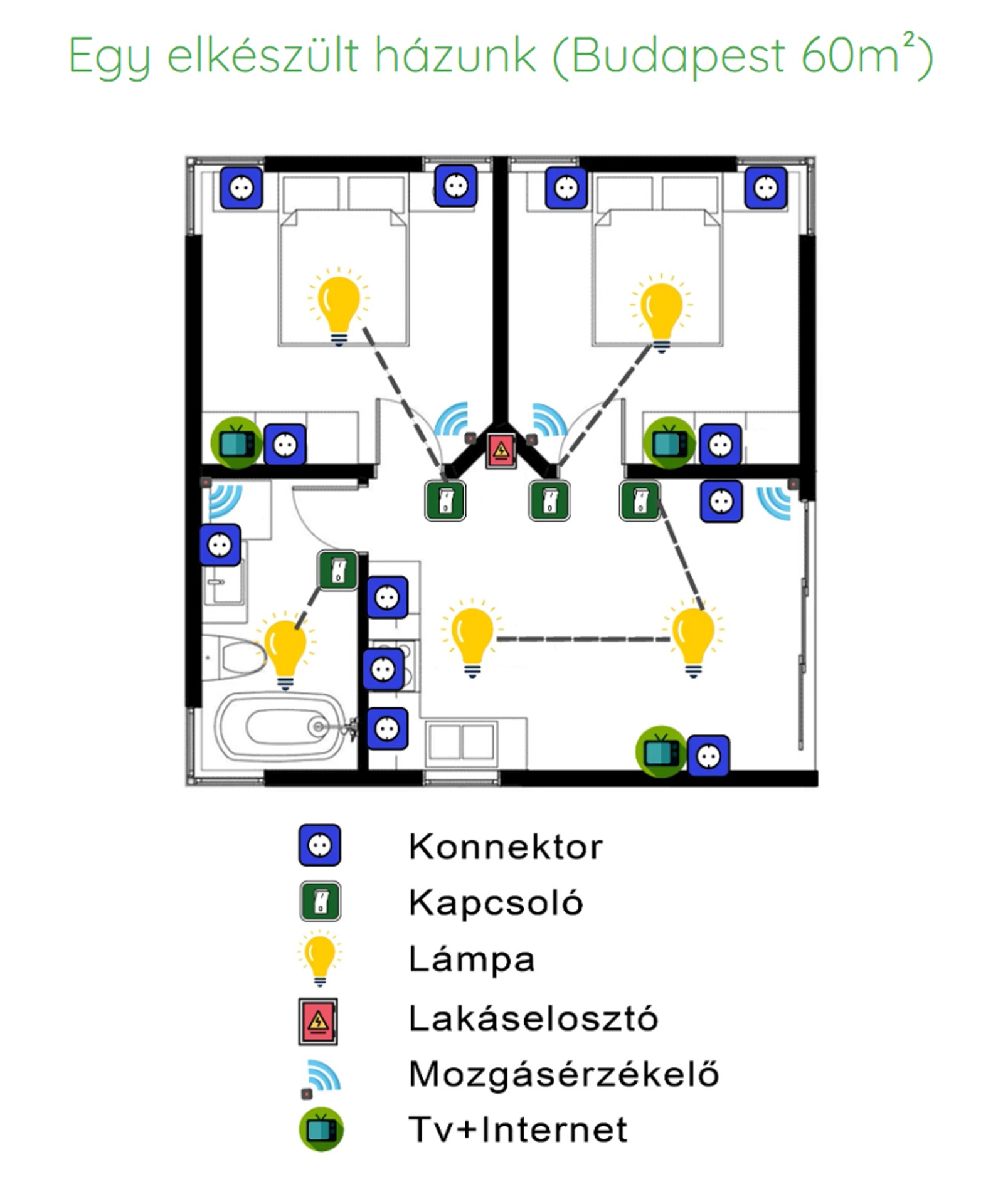 Teljes előszerelés, anyagokkal, kábelekkel, védőcsővel, lakáselosztó anyagokkal ebben az árban benne van!